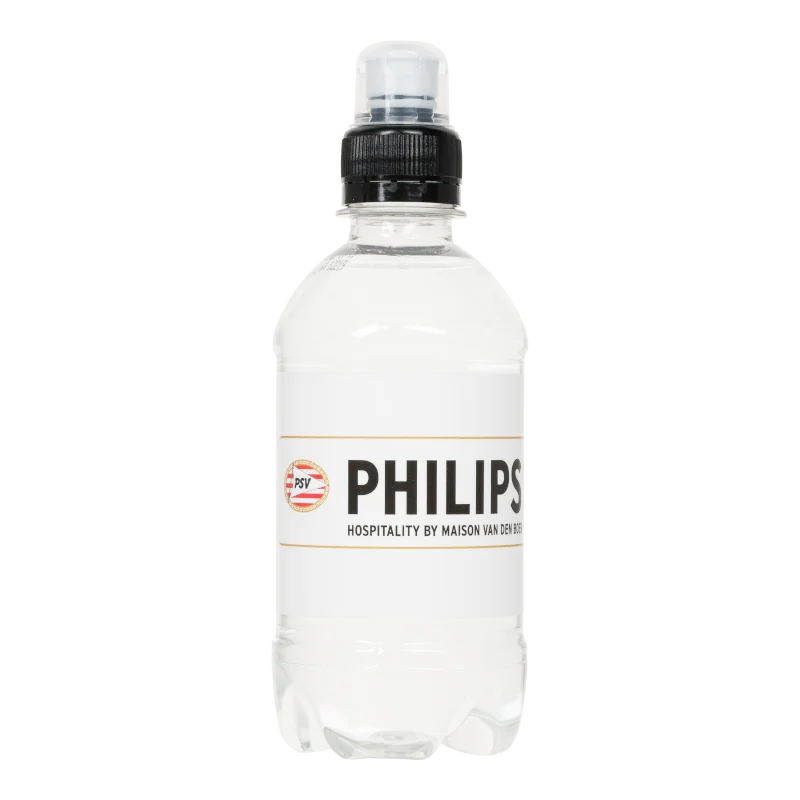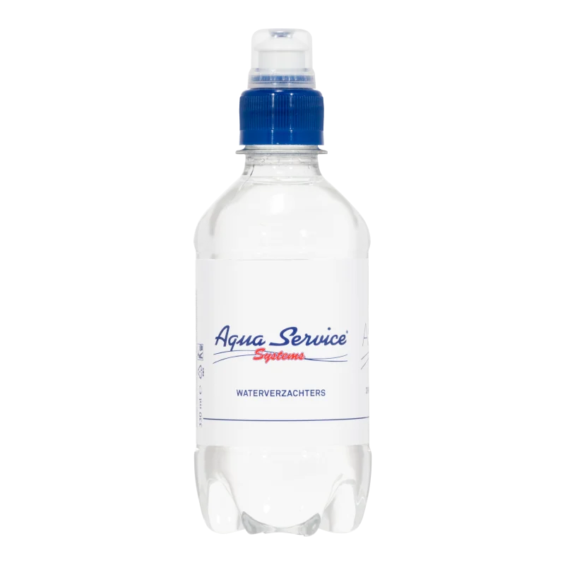 Choose our 33 cl rPET bottles with personalized label, made from 100% recycled PET and fully recyclable. We print your branded water bottles with a scratch- and waterproof label, designed entirely to your specifications. Each bottle is filled with pure spring water and comes with a white sports cap; other colors are available upon request.